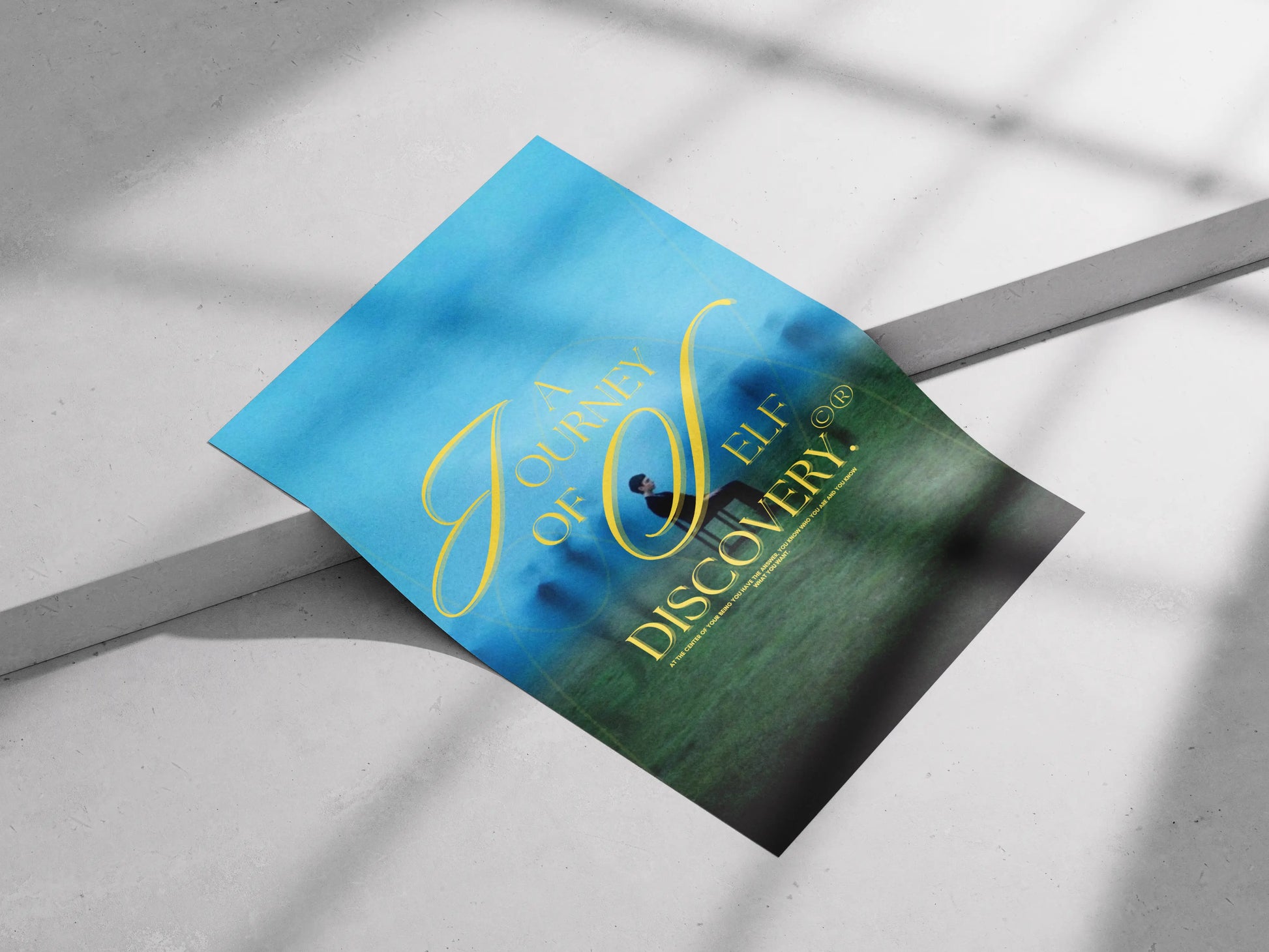 This poster features a minimalist and surreal design with a soft color gradient transitioning from a bright blue sky to a lush green field. The large, elegant script for "JOURNEY" and "SELF" curves around a solitary, silhouetted figure in the center. The full title "A JOURNEY OF SELF DISCOVERY." is a powerful and introspective message. The overall composition evokes a sense of personal reflection, growth, and the peaceful, solitary nature of finding oneself.