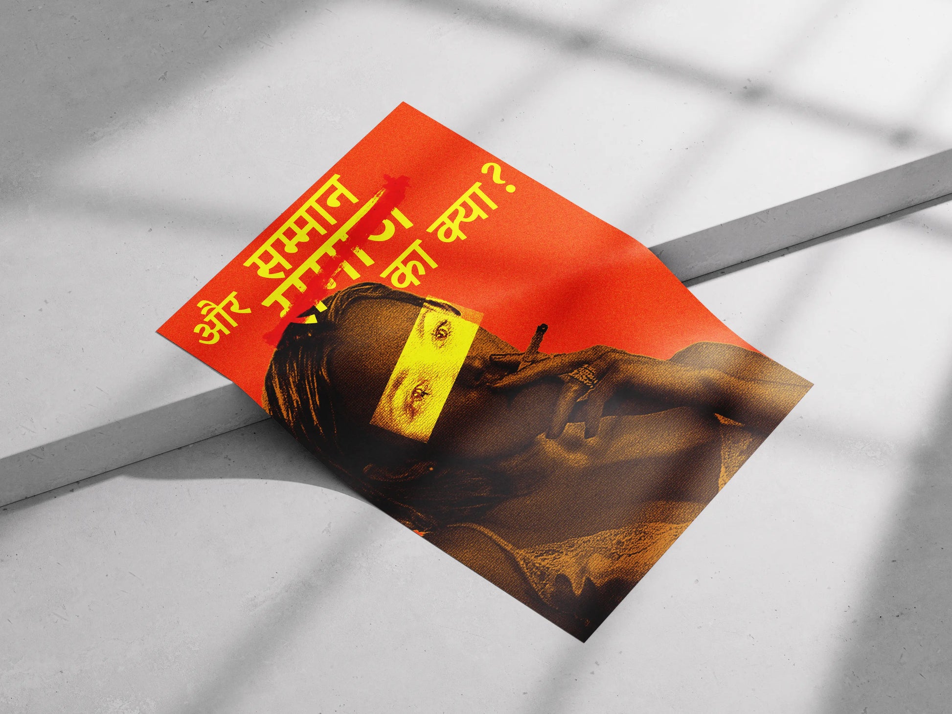 This poster features a bold, graphic design with a vibrant red and yellow color scheme and a grainy, textured finish. A woman is depicted smoking, her face partially obscured by a rectangular yellow block that only reveals her eyes. The text in Hindi reads "और सम्मान का क्या?" (Aur samman ka kya?), which translates to "And what about respect?" The design is a powerful social commentary, using the provocative imagery and direct question to challenge societal double standards and perceptions of women. This poster is a strong, feminist statement piece with a raw, modern aesthetic.