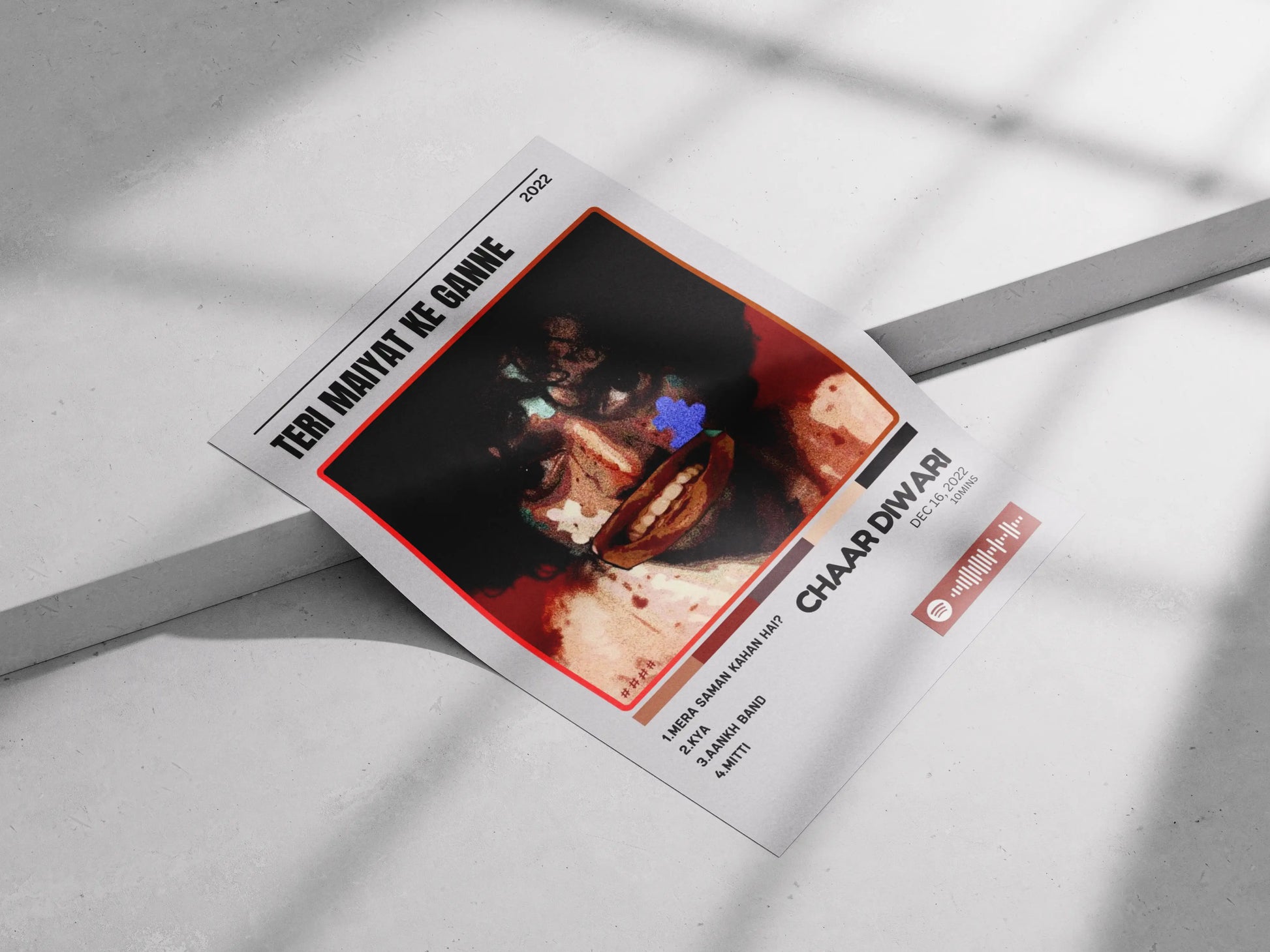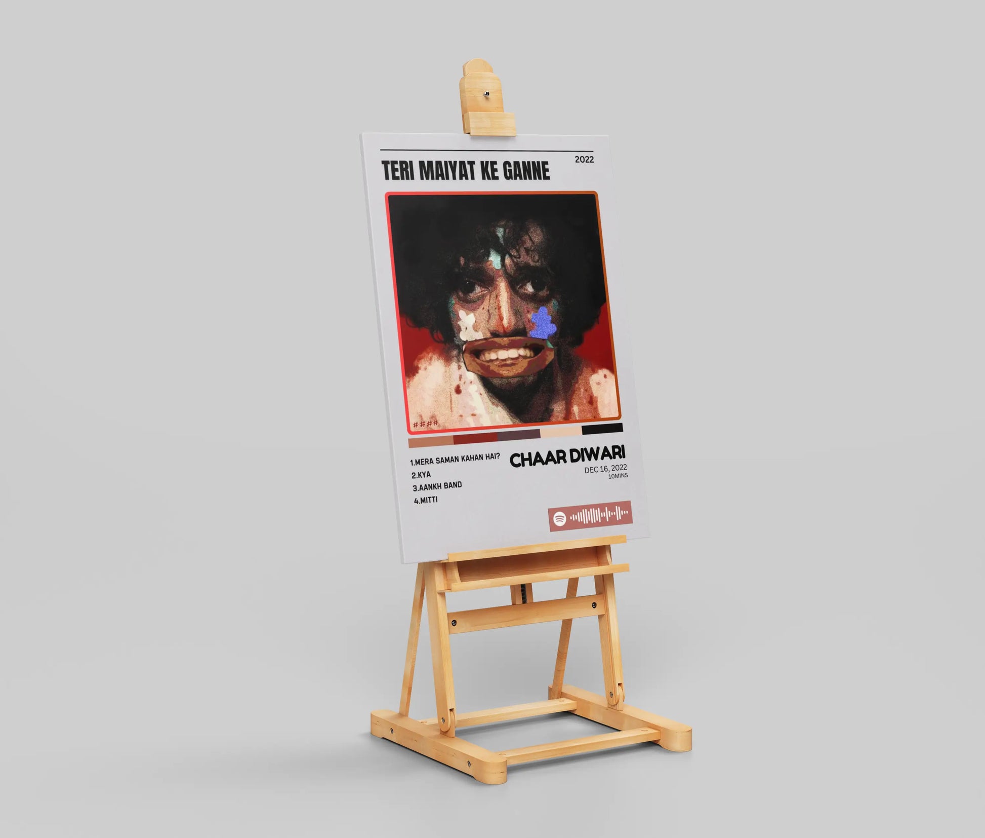 This poster serves as the striking, stylized cover art for CHAAR DIWARI's album "TERI MAIYAT KE GANNE" (Songs for Your Funeral). The central image is a distorted and raw portrait of the artist, featuring a messy, vibrant application of colors like white, blue, and teal on his face, contrasting with the dark, intense background. The design has a chaotic, punk-rock energy, amplified by the oddly placed mouth. The poster lists four tracks: "MERA SAMAN KAHAN HAI?," "KYA," "AANKH BAND," and "MITTI," with the release date DEC 16, 2022. The included Spotify player symbol and visualizer make it instantly recognizable as a modern music promotion piece.