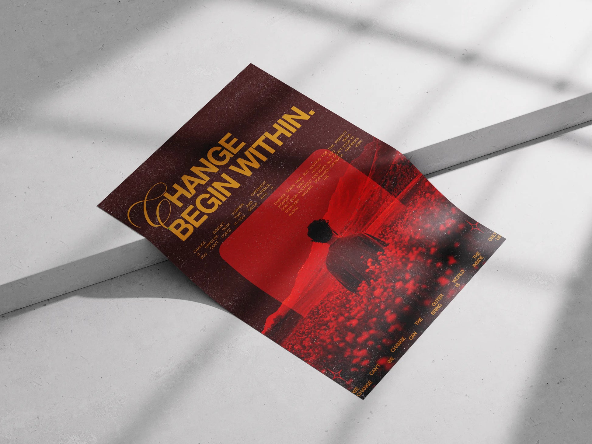 This poster features a powerful and moody design with a rich, dark red color palette. A solitary figure is seen from behind, standing in a field of red flowers, facing a metaphorical red doorway or frame. The central message, "CHANGE BEGIN WITHIN.", is a bold and clear call to action. The poster includes smaller, fragmented text that adds depth, with phrases like "CHANGE DOESN'T HAPPEN OVERNIGHT..." and "WE CAN'T CHANGE THE OUTER WORLD..." The design's grainy texture and deep colors create a cinematic feel, making it a compelling piece for those seeking personal growth and a deeper understanding of themselves.
