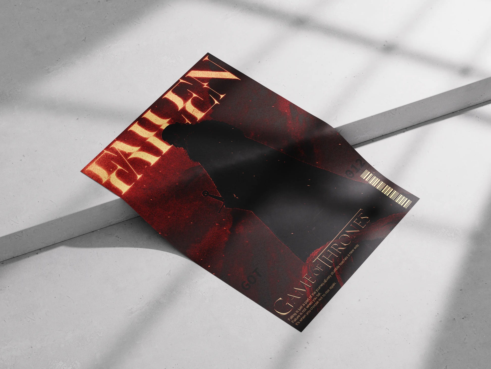 This dramatic poster features an image of Jon Snow (The Night's Watch King) standing heroically, clad in his dark fur cloak and holding his sword, Longclaw. The title "FALLEN" glows with a burning, golden light that contrasts against the figure's silhouette and the dark, textured background. Below the character, the title "GAME of THRONES" is prominent, along with an inspirational quote: "Failing is just a part of the journey, every stumble teaches a new way. Failure is not when you fall, it's when you choose not to rise again." The intense, fiery color palette and grainy texture capture the dark, epic tone of the HBO series.