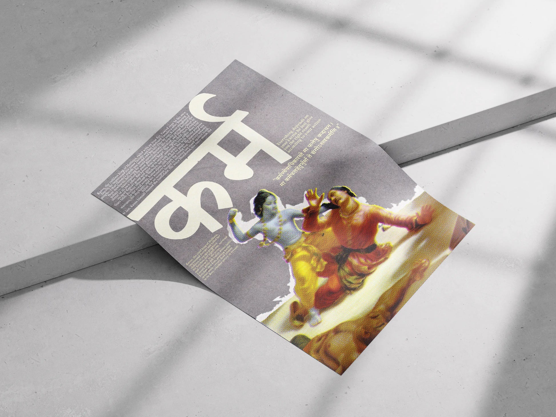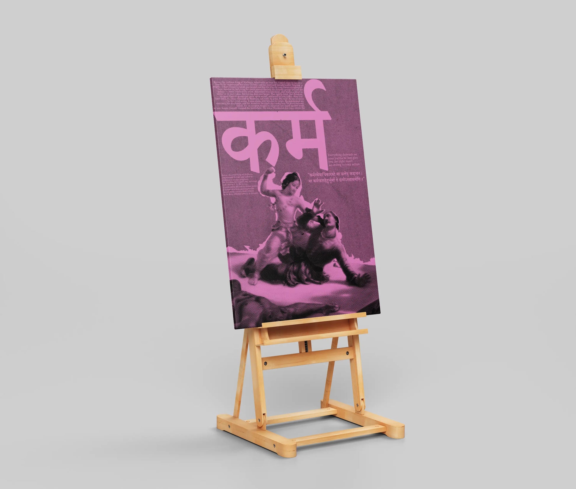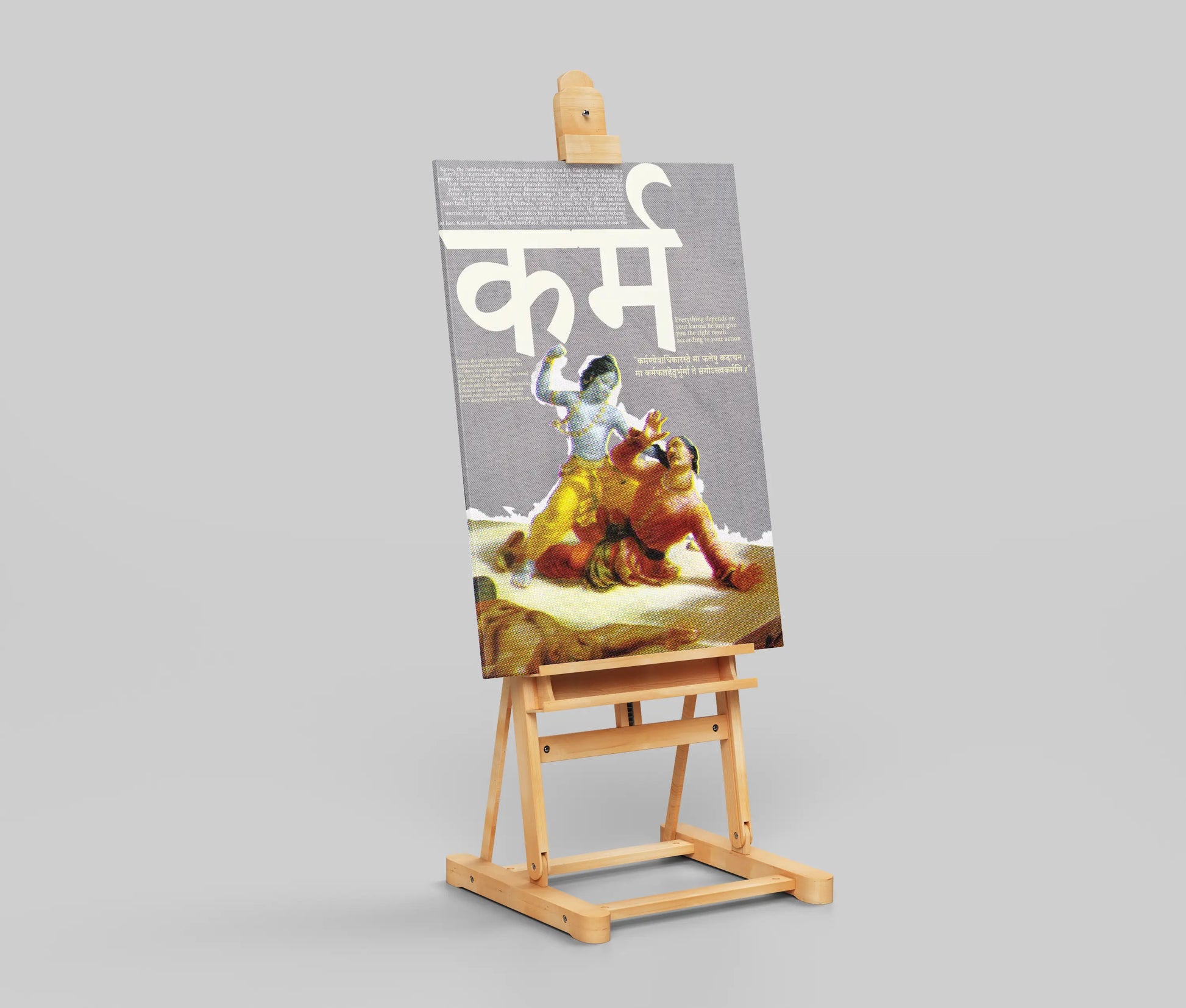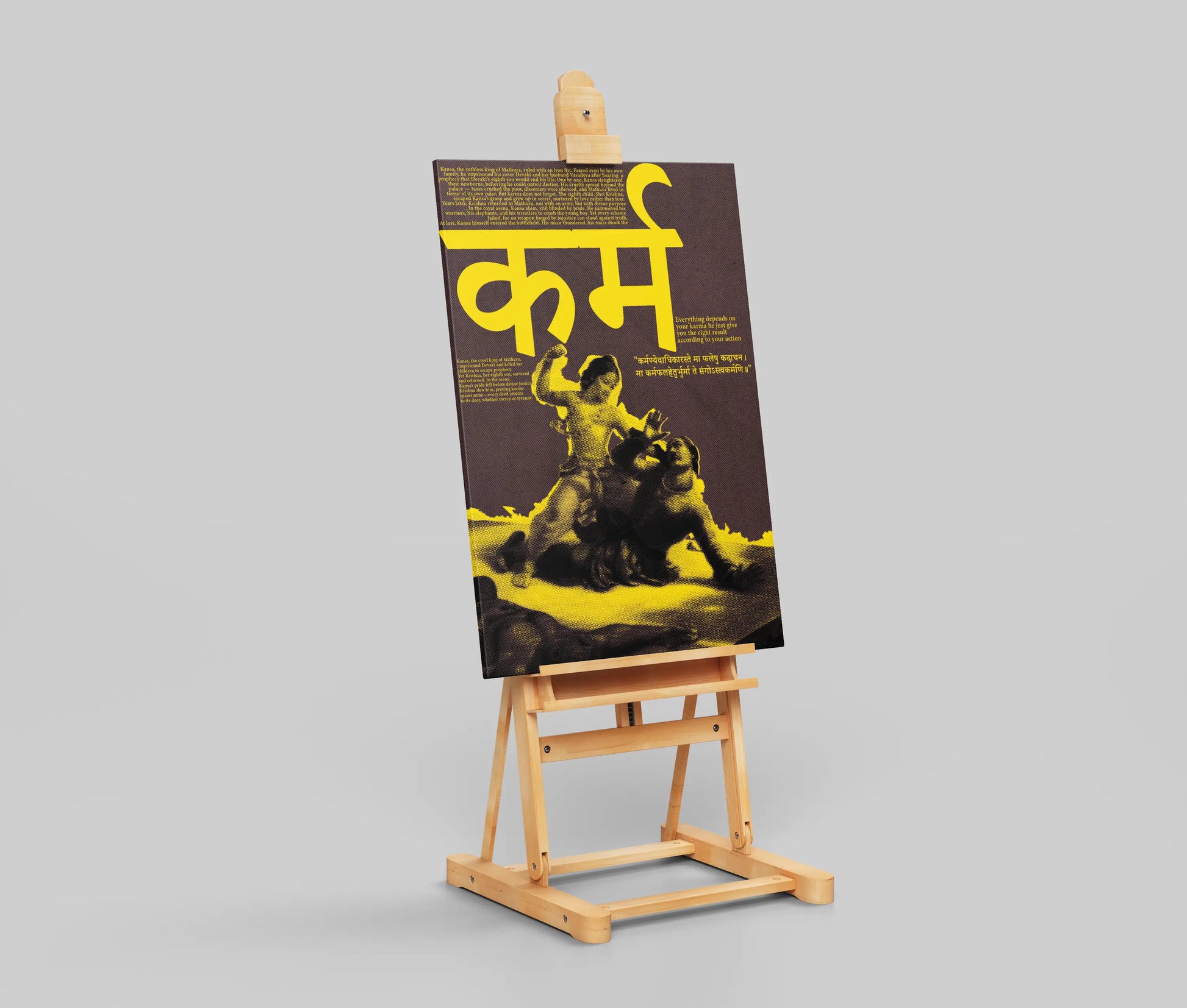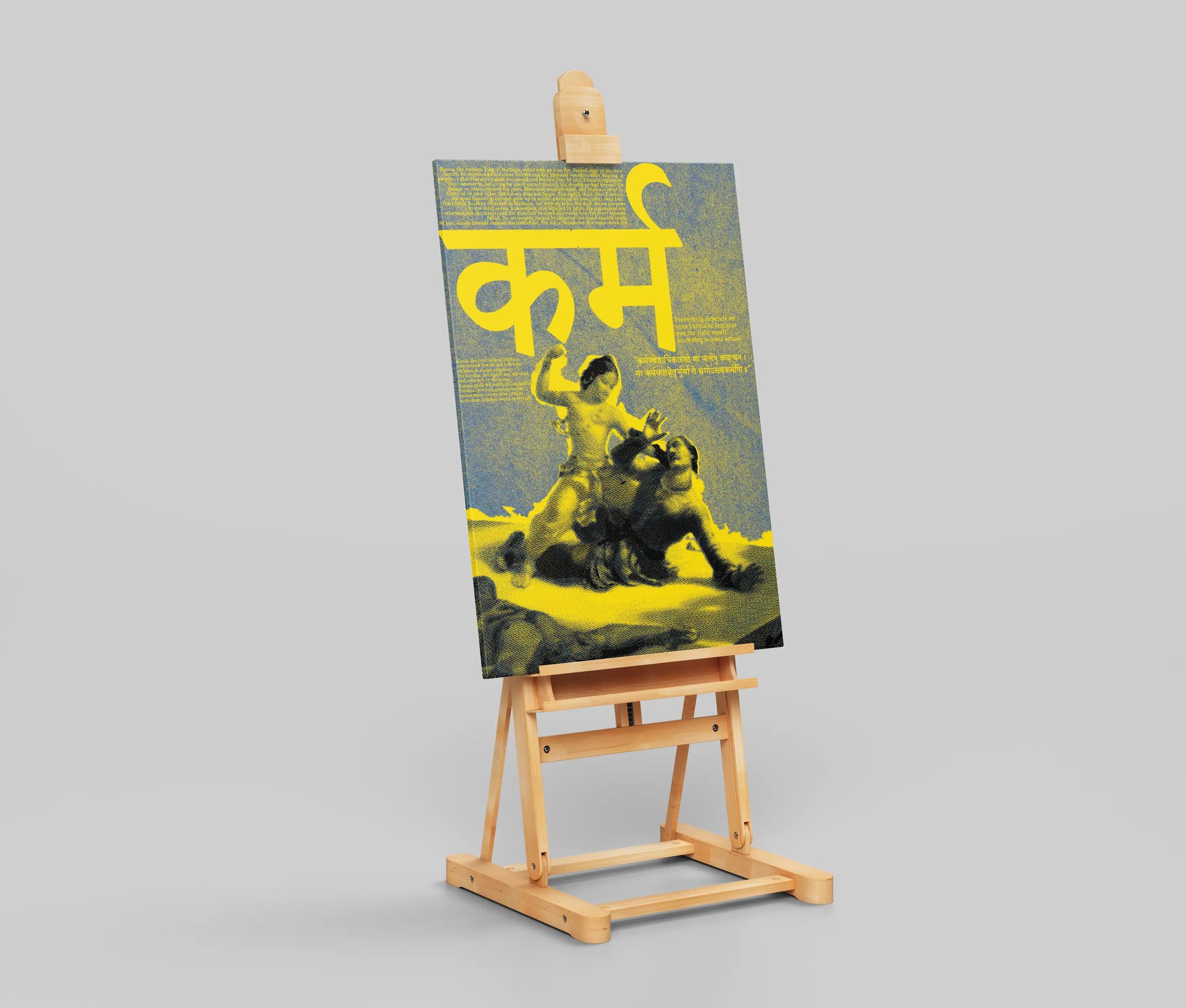 This poster features a powerful and dynamic depiction of a mythological battle, rendered with a modern, half-tone aesthetic. The large, bold Devanagari script for "कर्म" (Karma) dominates the top, serving as the central theme. Below, a vibrant image of Lord Krishna, in a striking yellow and blue, is shown defeating his uncle, Kamsa. The grainy texture and stylized colors give the piece a retro, comic-book feel. The text on the sides explains the concept of Karma and includes a quote in Sanskrit from the Bhagavad Gita: "कर्मण्येवाधिकारस्ते मा फलेषु कदाचन। मा कर्मफलहेतुर्भुर्मा ते संगोऽस्त्वकर्मणि ॥" This poster is a great blend of traditional mythology with contemporary graphic design
