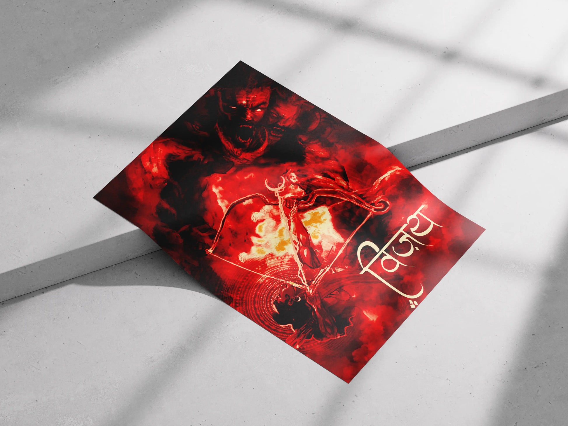This poster features a highly dramatic and intense depiction of Lord Ram in the act of firing an arrow, set against a chaotic backdrop of swirling red and black tones. The artwork uses a rich, fiery color palette of deep reds and glowing orange-yellows, creating a powerful sense of divine action and impending conflict. The central image is surrounded by subtle, traditional patterns, giving it a mythological depth. The word "विजय" (Vijay), meaning "Victory," is prominently featured in a large, elegant white and gold Hindi script, underscoring the spiritual and heroic theme of the piece.