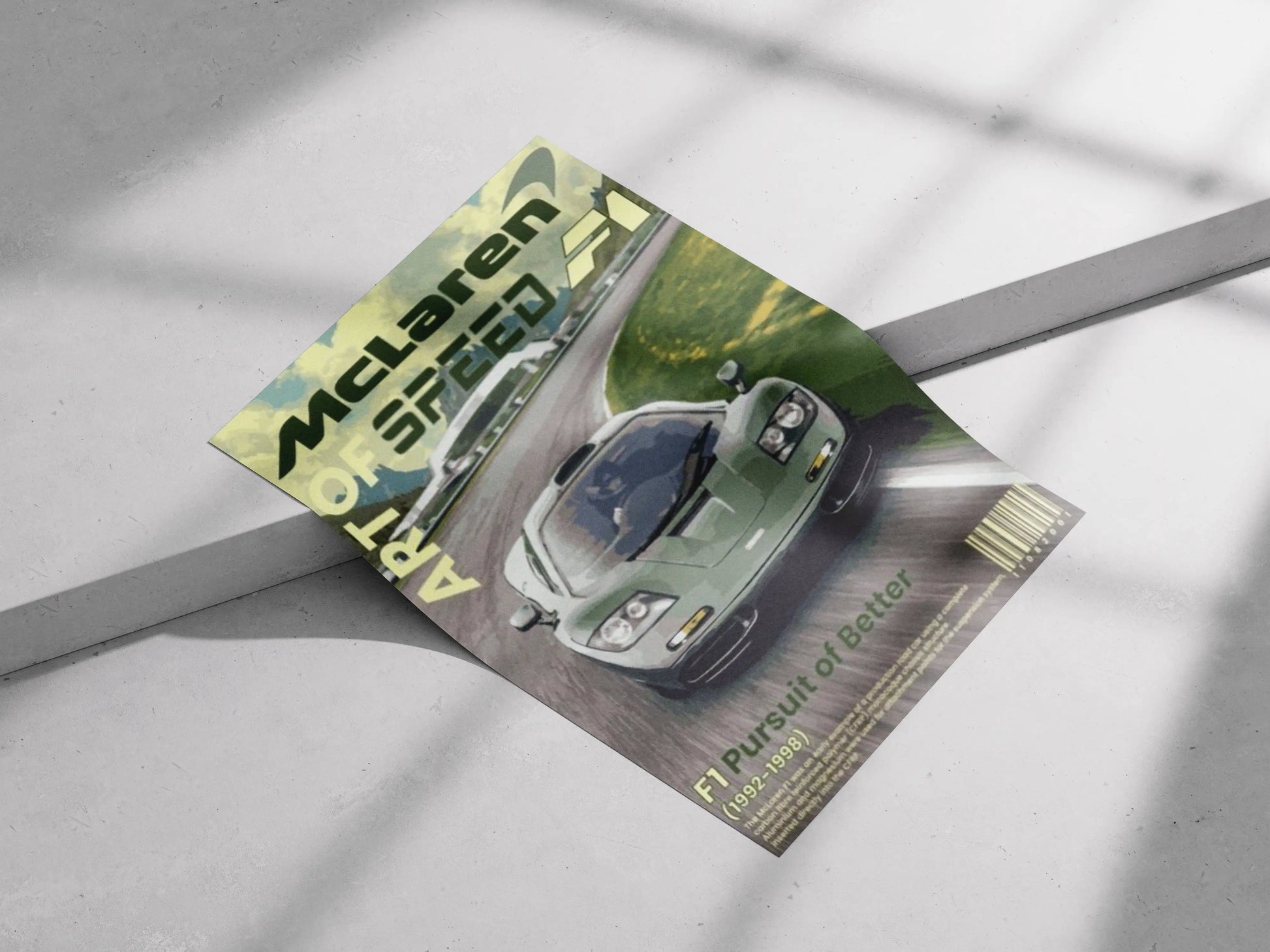 Capture the spirit of '90s automotive excellence with this stunning McLaren F1 Art Print, designed in the compelling style of a classic vintage magazine cover. This poster immortalizes one of the greatest supercars ever built, produced between 1992 and 1998. The artwork features the iconic McLaren F1 in a muted, stylish green driving down a scenic racetrack, perfectly encapsulating the theme "F1 Pursuit of Better." The design uses bold, retro typography, including the striking McLaren logo and the tagline "ART OF SPEED F1." This print is a direct tribute to the car's groundbreaking engineering, noting its status as an early example of a production road car using a carbon fibre monocoque chassis structure.