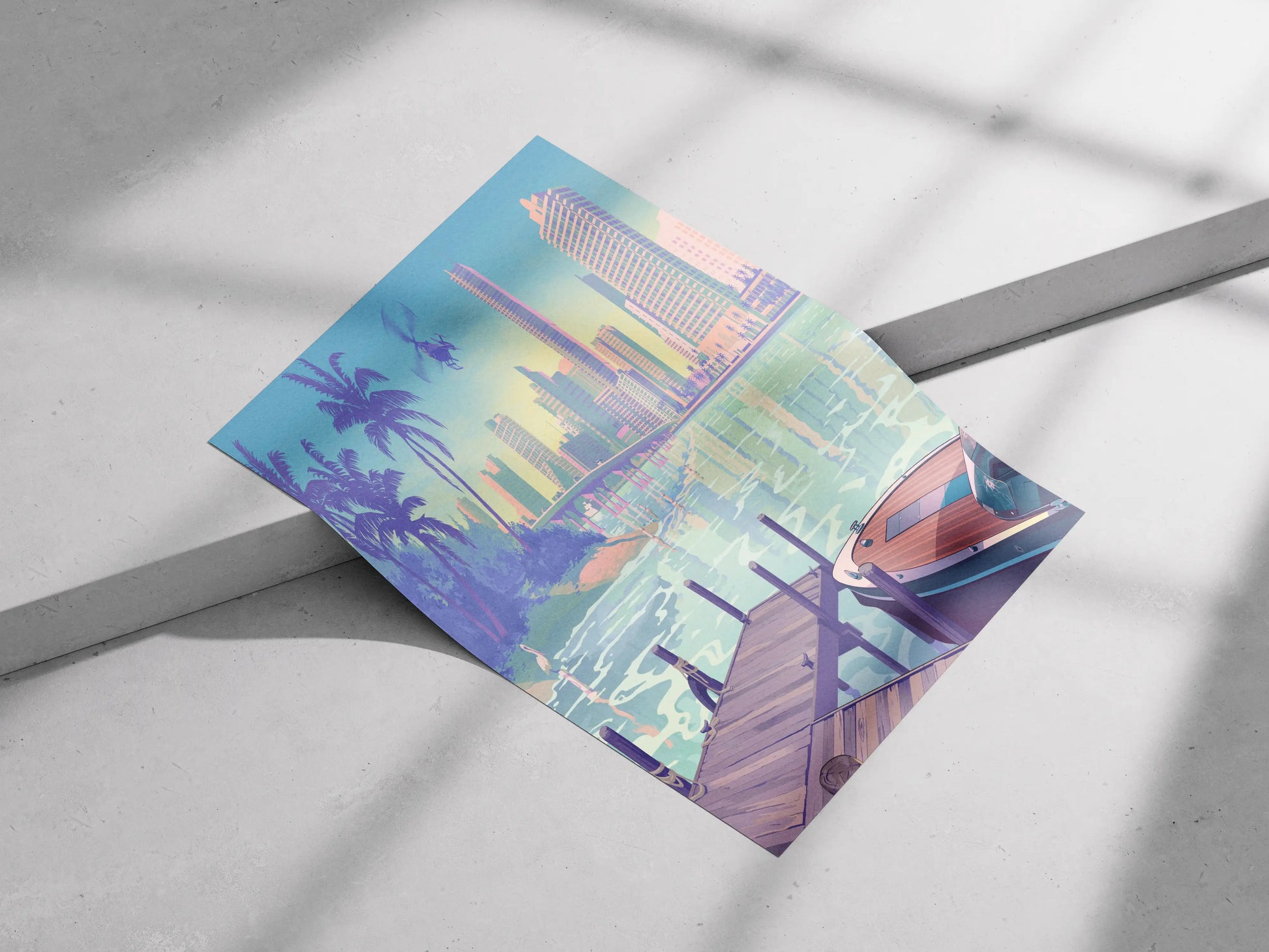 This stunning Miami pixel art wallpaper, capturing the retro 8-bit aesthetic of a classic '80s cityscape. Perfect for your desktop, this vibrant image features a boat, a calm river, and iconic palm trees.
