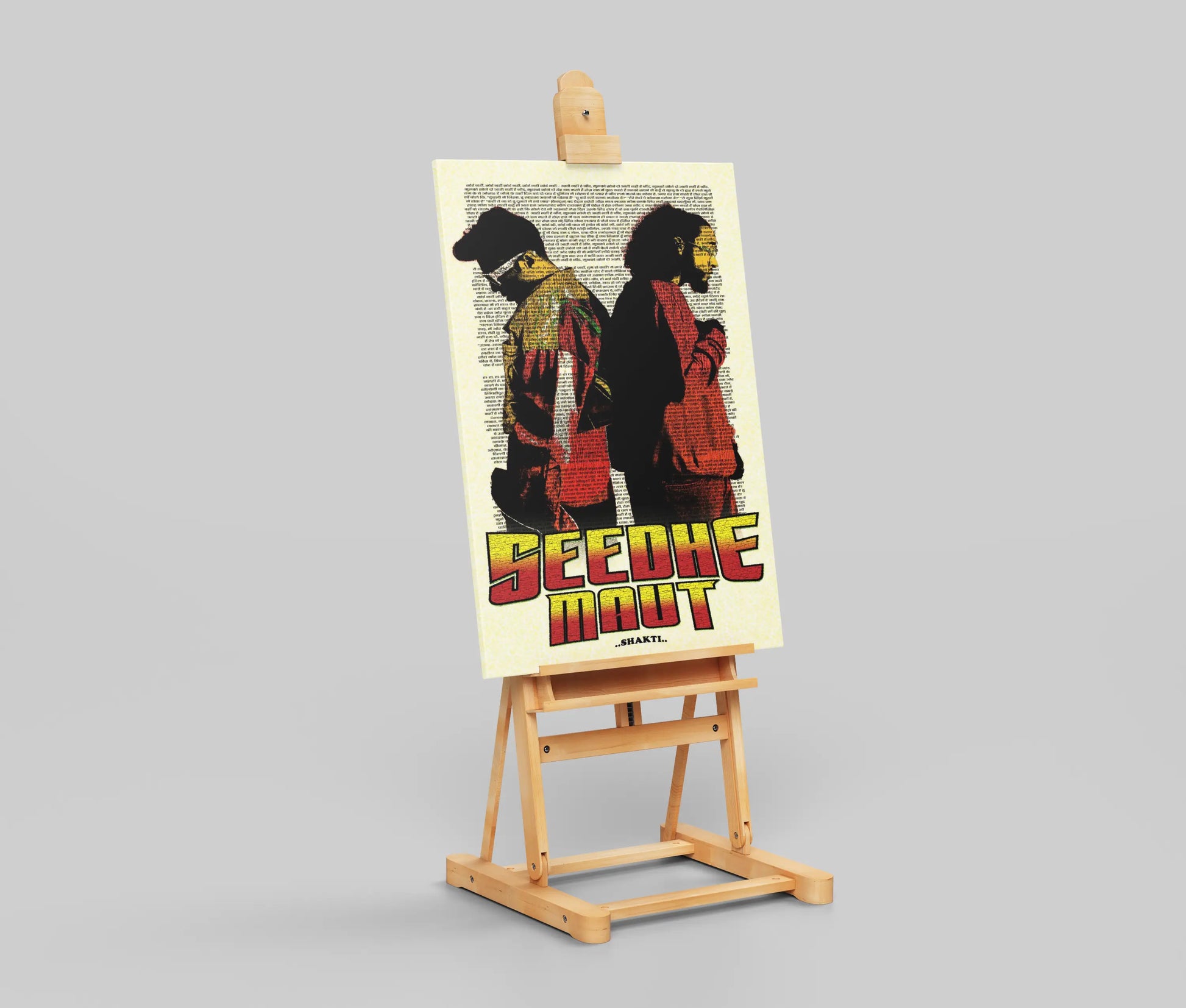 This poster features a powerful and deeply layered design for the hip-hop duo SEEDHE MAUT. The two artists are depicted in stylized, back-to-back silhouettes that are filled with dense, interwoven text, suggesting the intensity and volume of their lyrics. The background is a pale yellow texture also covered in Hindi text, creating a visual noise of words and meaning. The title "SEEDHE MAUT" in a bold, cracked, red-and-yellow font dominates the bottom, with "..SHAKTI.." serving as the powerful subtitle. This poster is a strong, visual representation of lyrical depth, power, and the aggressive style of underground Indian hip-hop.
