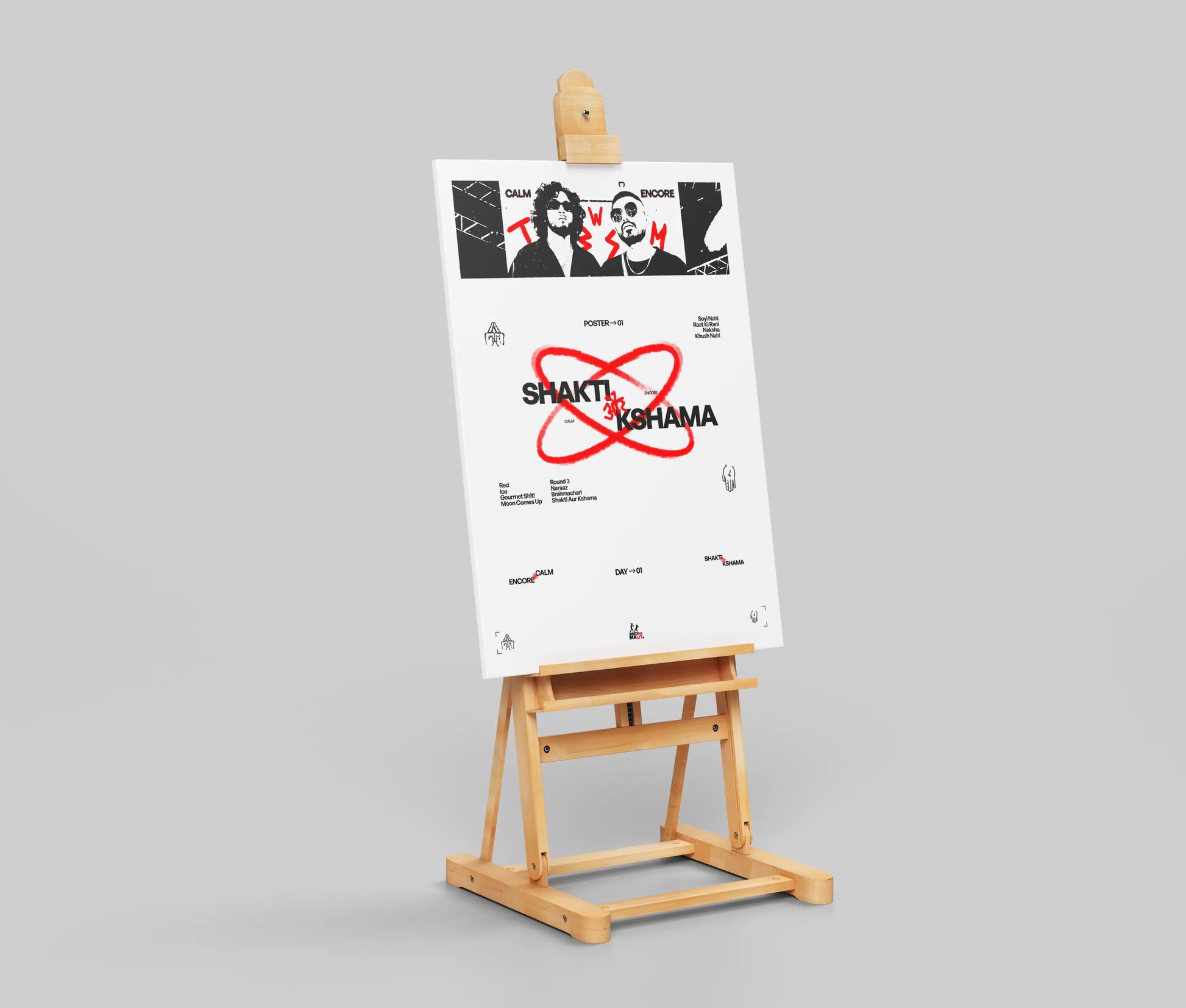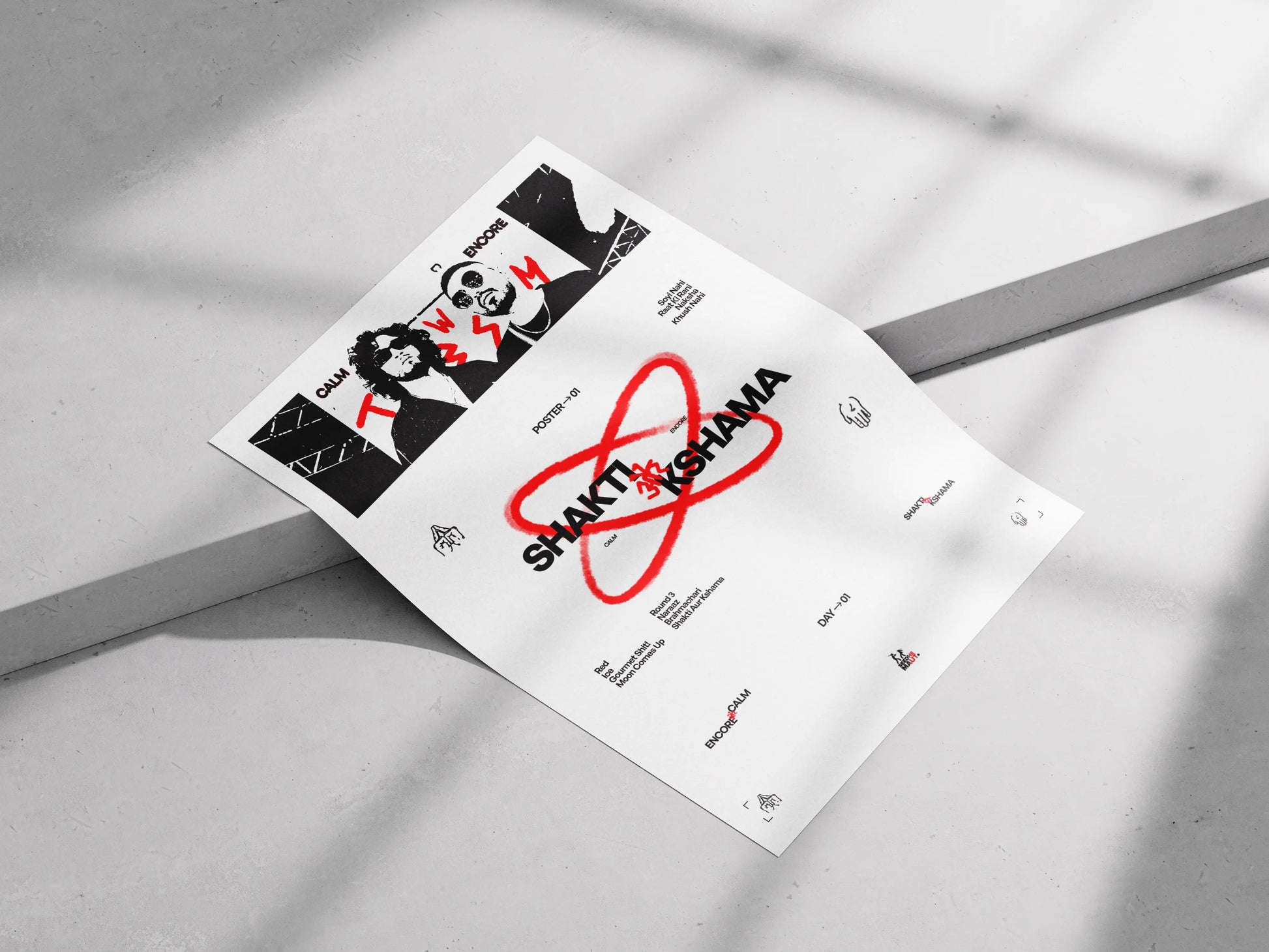 This poster has a fragmented, DIY aesthetic that feels like a modern zine or street art collage. It features black and white portraits of the artists, Calm and Encore, with a bold, scribbled red ring and the text "SHAKTI AUR KSHAMA" at the center. The design is filled with small, scattered details, including track titles like "Red Ice" and "Round 3," and other phrases that give it a raw, insider feel. This poster is a great piece for fans of the artists and those who appreciate a unique, deconstructed graphic design style.