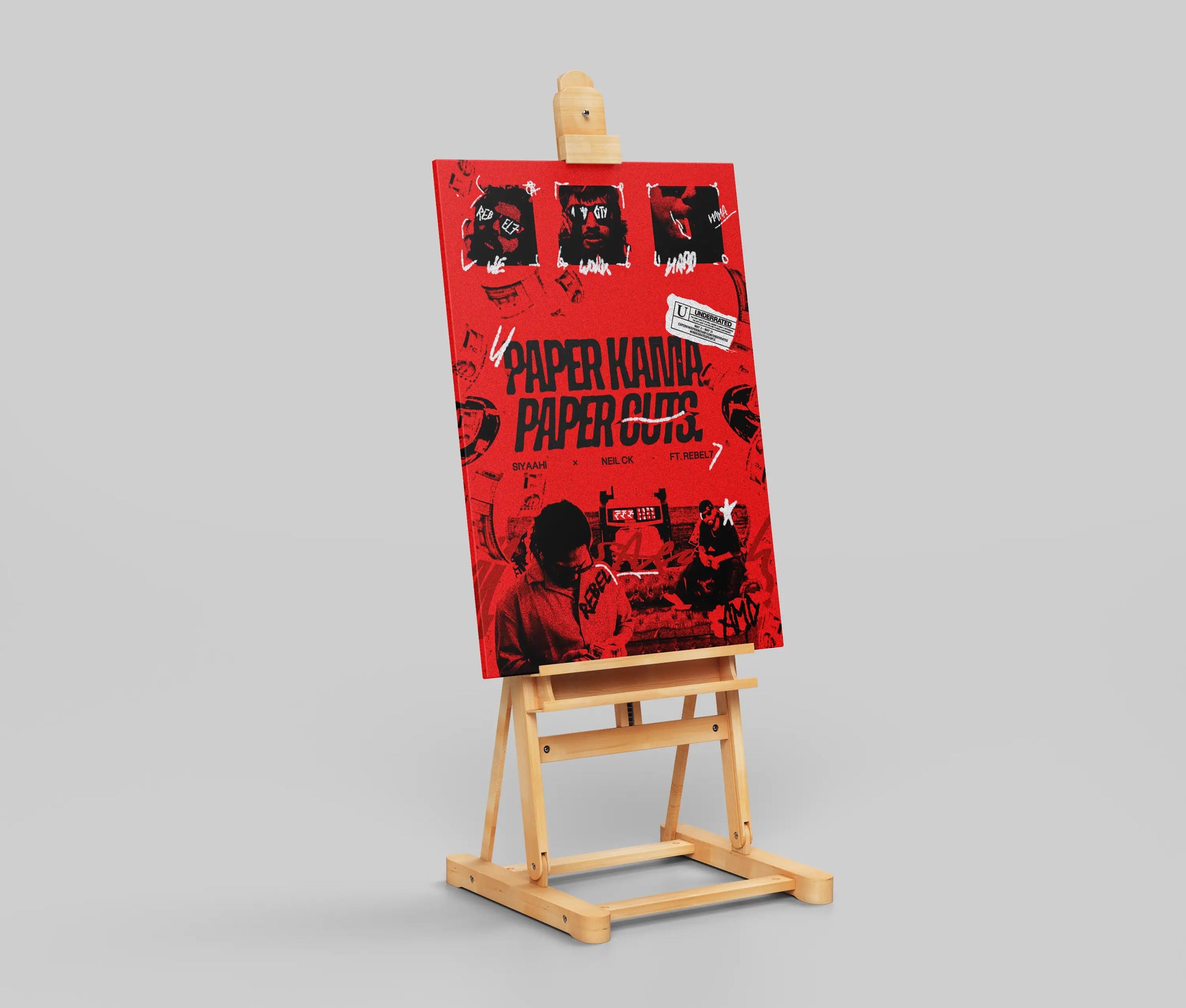 This poster features a chaotic and high-energy design with a vibrant red and black color scheme. The title "PAPER KAMANA PAPER CUTS" is a bold, graphic centerpiece, layered with various textures and visual noise. The poster includes distorted black-and-white images of the artists, SIYAAHI, NEIL CK, and REBEL 7, along with scattered elements like stylized money and a "U UNDERRATED" sticker, creating a collage-like, urban aesthetic. The overall design is raw, gritty, and rebellious, perfectly capturing the spirit of modern hip-hop culture.