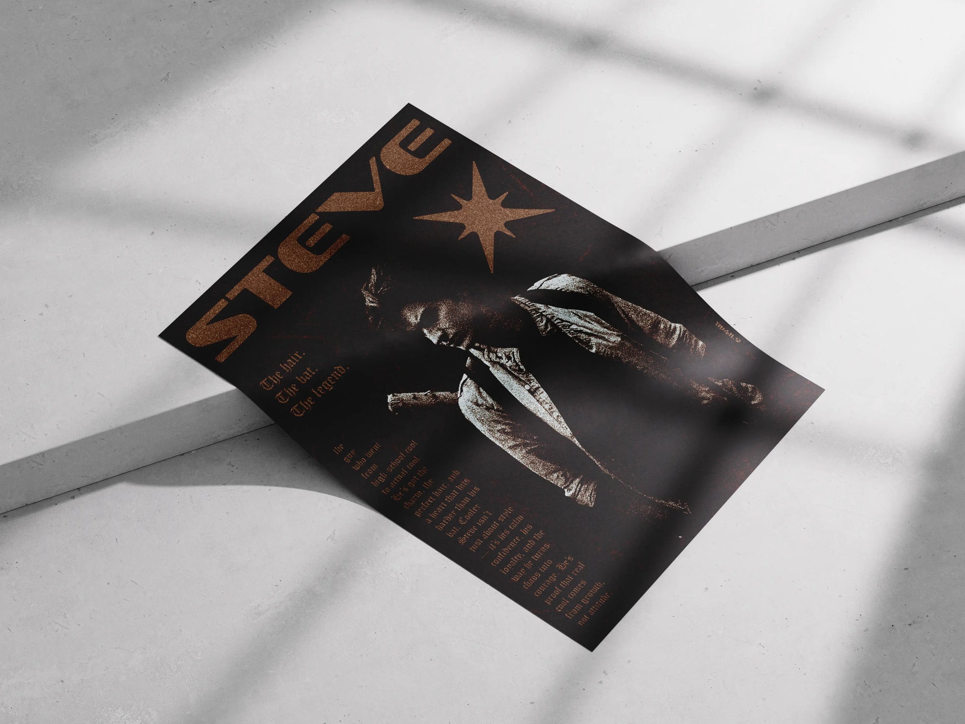 This poster is a dark, moody, and highly stylized tribute to Steve Harrington from Stranger Things, rendered in a grainy, vintage aesthetic with a sepia and deep brown color palette. The bold, textured title "STEVE" dominates the top. The poster includes key taglines like "The hair. The bat. The legend." and a long body of text that elevates the character from "high-school cool to actual cool," highlighting his growth, loyalty, and courage. The overall design is reminiscent of a retro magazine profile or an 80s movie title card, making it a perfect piece for fans of the show and the character's emotional journey.