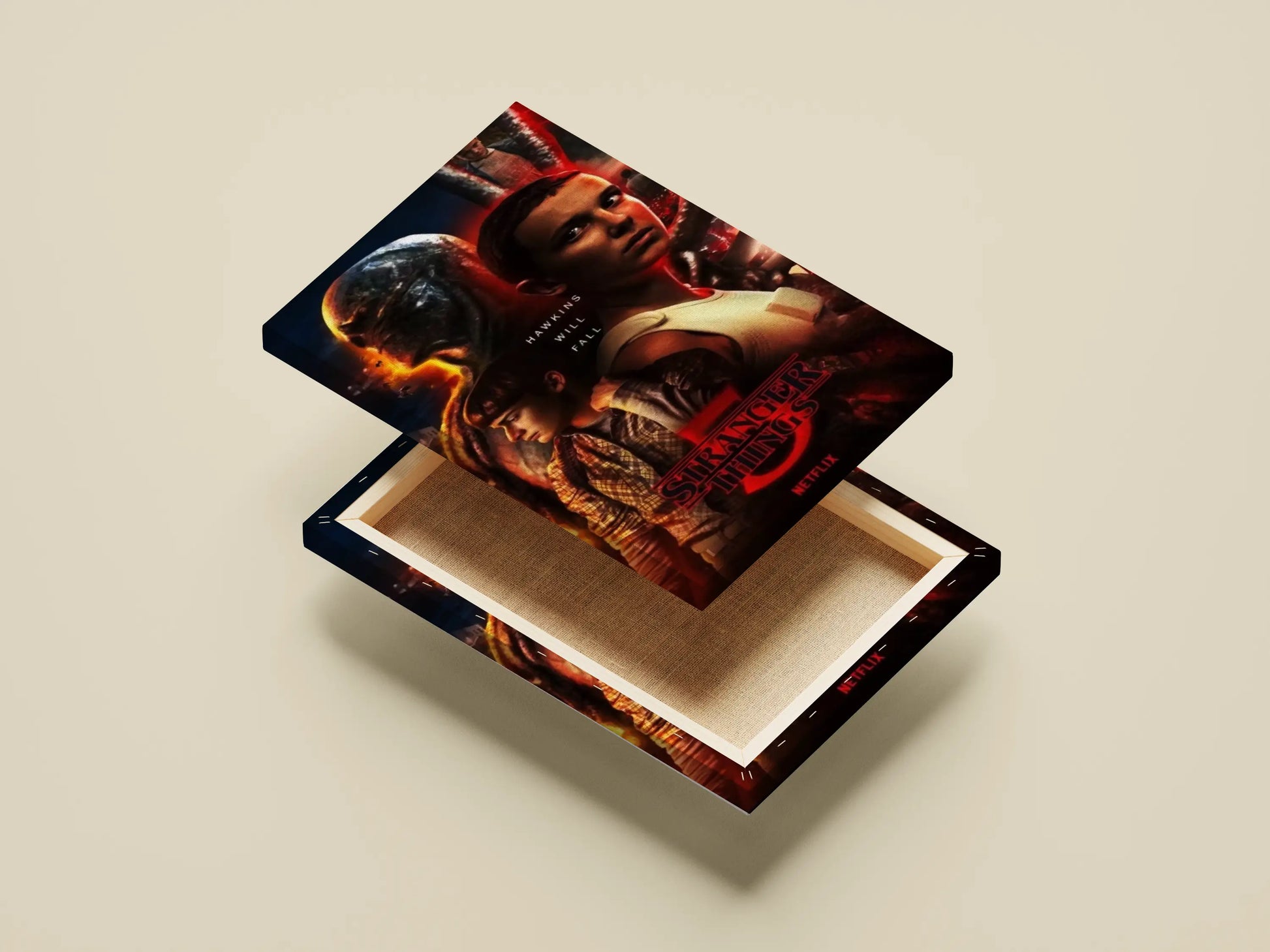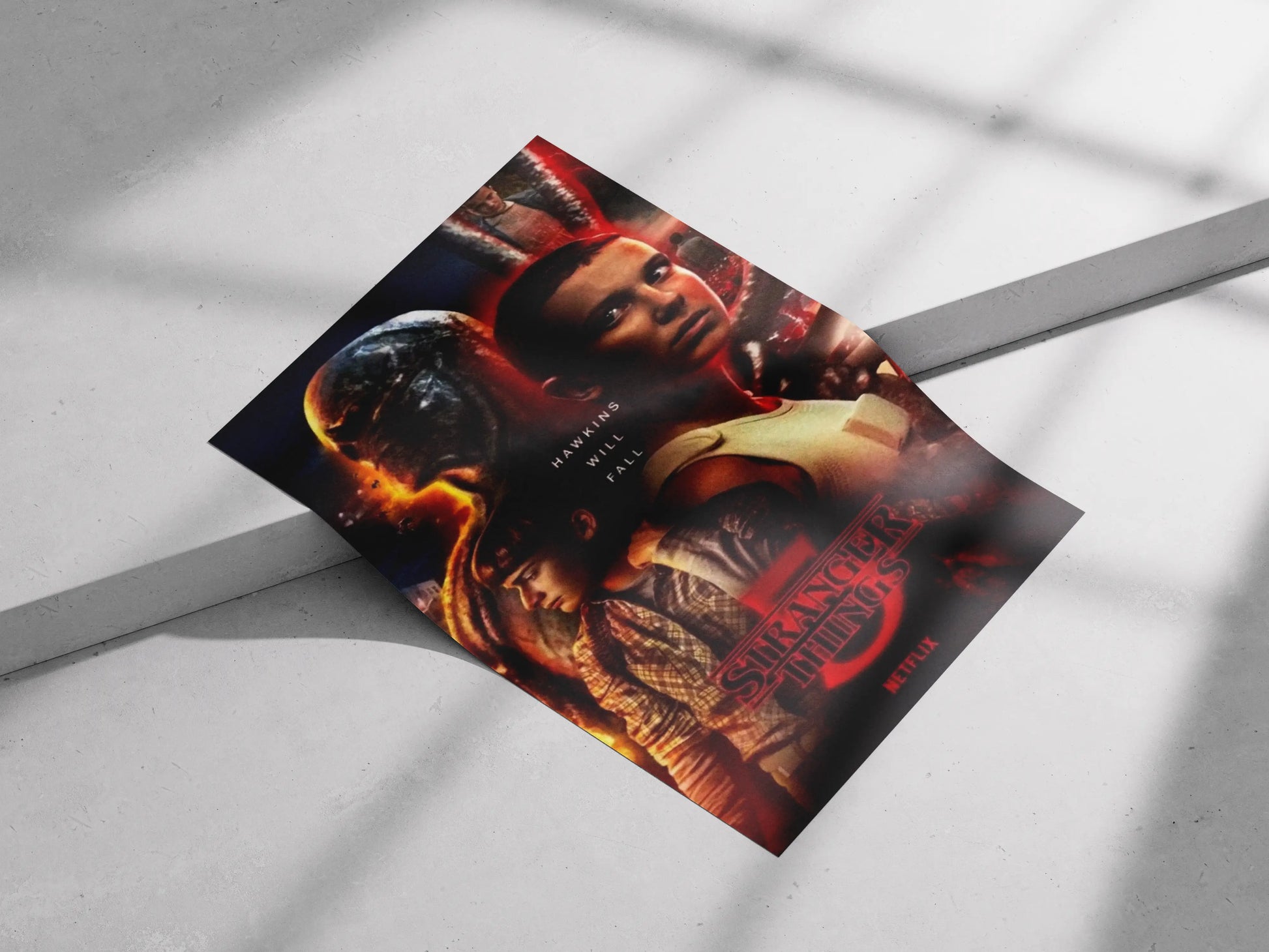 This highly dramatic and intense poster features the core conflict of the latest season of Stranger Things. Eleven and Will Byers stand prominently in the foreground, their expressions conveying urgency and fear. Behind them looms the terrifying antagonist, Vecna, whose presence is bathed in a dramatic glow of red and orange, symbolizing the Upside Down's escalating threat. The chilling tagline "HAWKINS WILL FALL" sets a tone of impending doom and high stakes. This cinematic, dark-themed poster is a perfect representation of the show's blend of 80s nostalgia and horror.