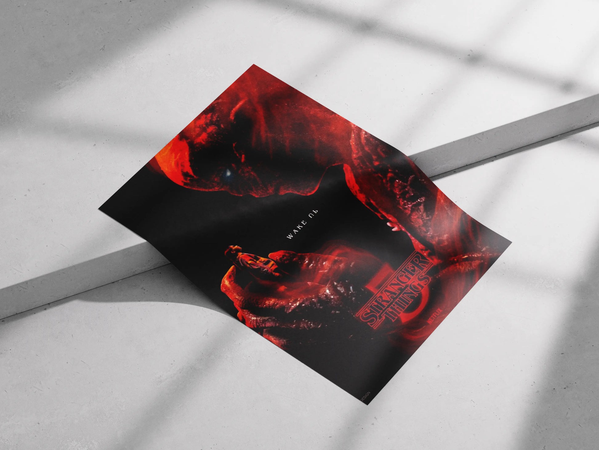 This poster features an intensely dramatic and nightmarish image for Stranger Things 5, symbolizing the psychological hold of the villain, Vecna. The towering, monstrous figure of Vecna, rendered in grotesque detail with a fiery red and dark aesthetic, holds a tiny, vulnerable figure (likely Eleven) in his massive, blood-red hand. The minimalist, chilling text "WAKE UP" is placed between the two figures, referencing Vecna's haunting mental attacks and the need for Eleven to regain her full power. The extreme scale difference and vivid horror elements make this a powerful, unsettling, and highly anticipated piece of promotional art.