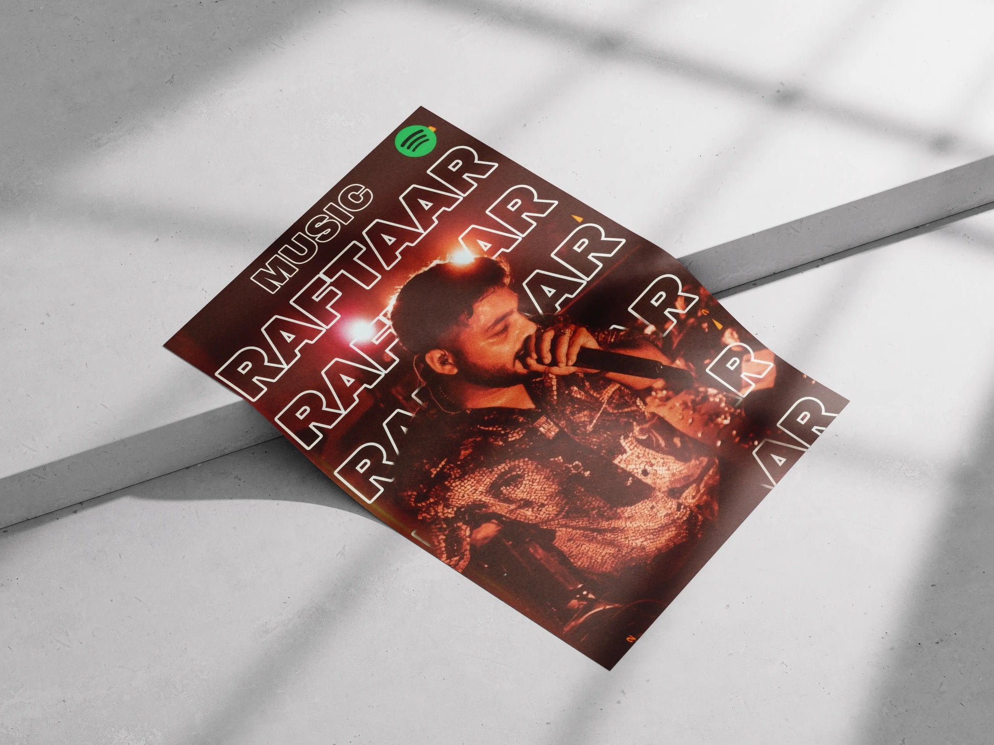 This poster is a high-energy, visually intense tribute to the rapper RAFTAAR. The design features a close-up, warm-toned image of the artist intensely performing live, clutching a microphone. The background is dominated by the repetitive, bold, white, and red text "RAFTAAR," creating a rhythmic, pulsating effect that mimics the energy of a concert. The casual Hindi phrase in the filename, "Tera bhai raftaar" (Your brother Raftaar), captures his approachable, fan-favorite persona. The small "MUSIC" and Spotify logo ground it as modern music promotion.