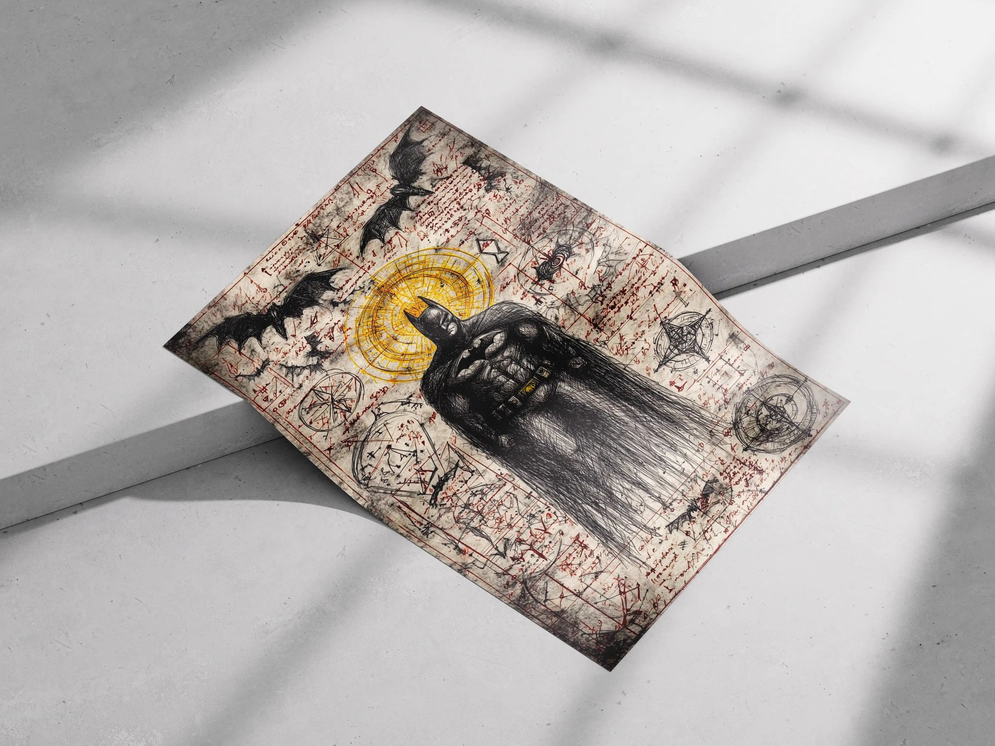 Step into the shadows with our unique Batman poster, a masterpiece that re-imagines the Dark Knight as a figure of ancient lore. This artwork, reminiscent of an alchemical manuscript or a medieval codex, features a hand-drawn illustration of Batman surrounded by intricate symbols, cosmic diagrams, and arcane text.