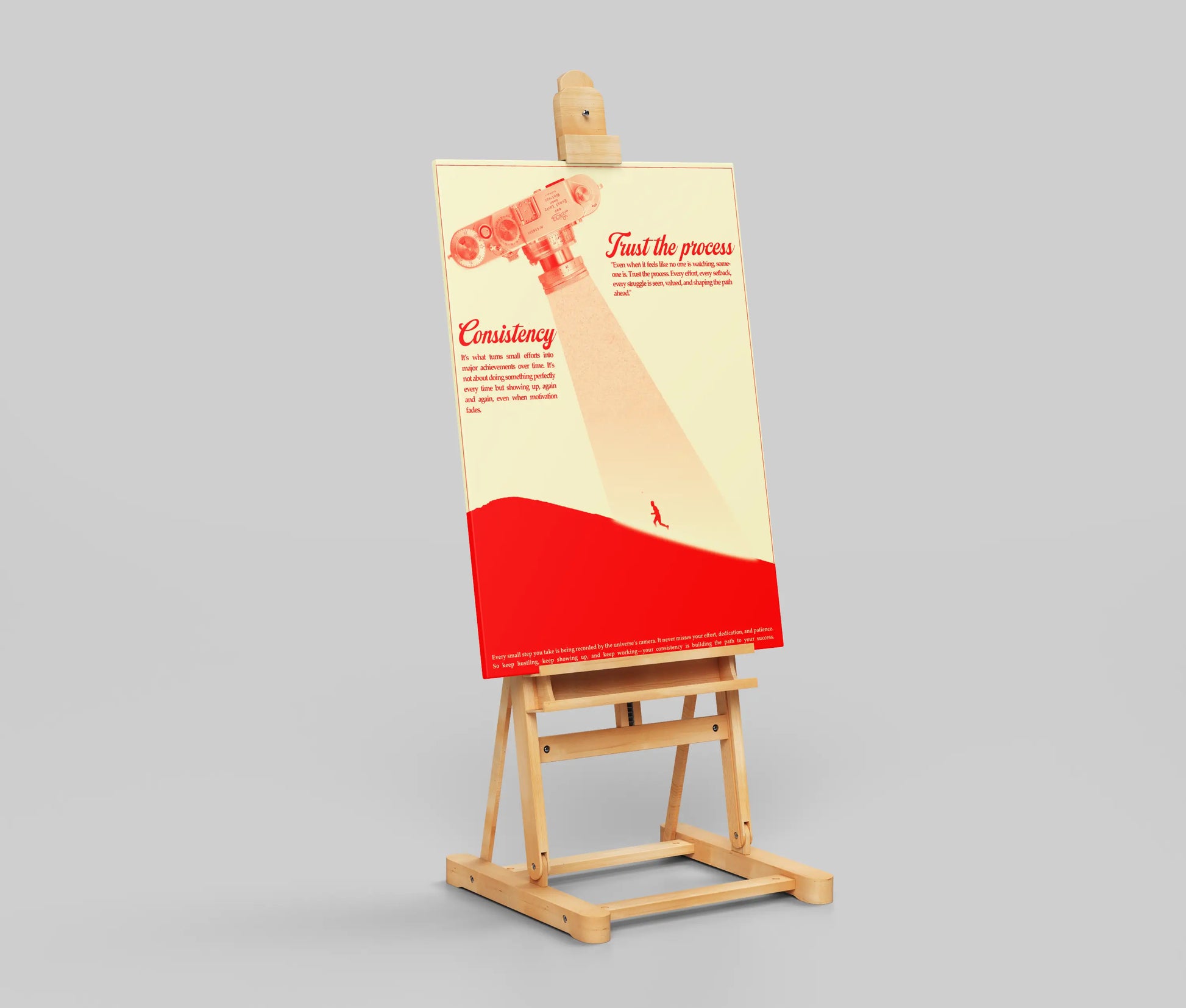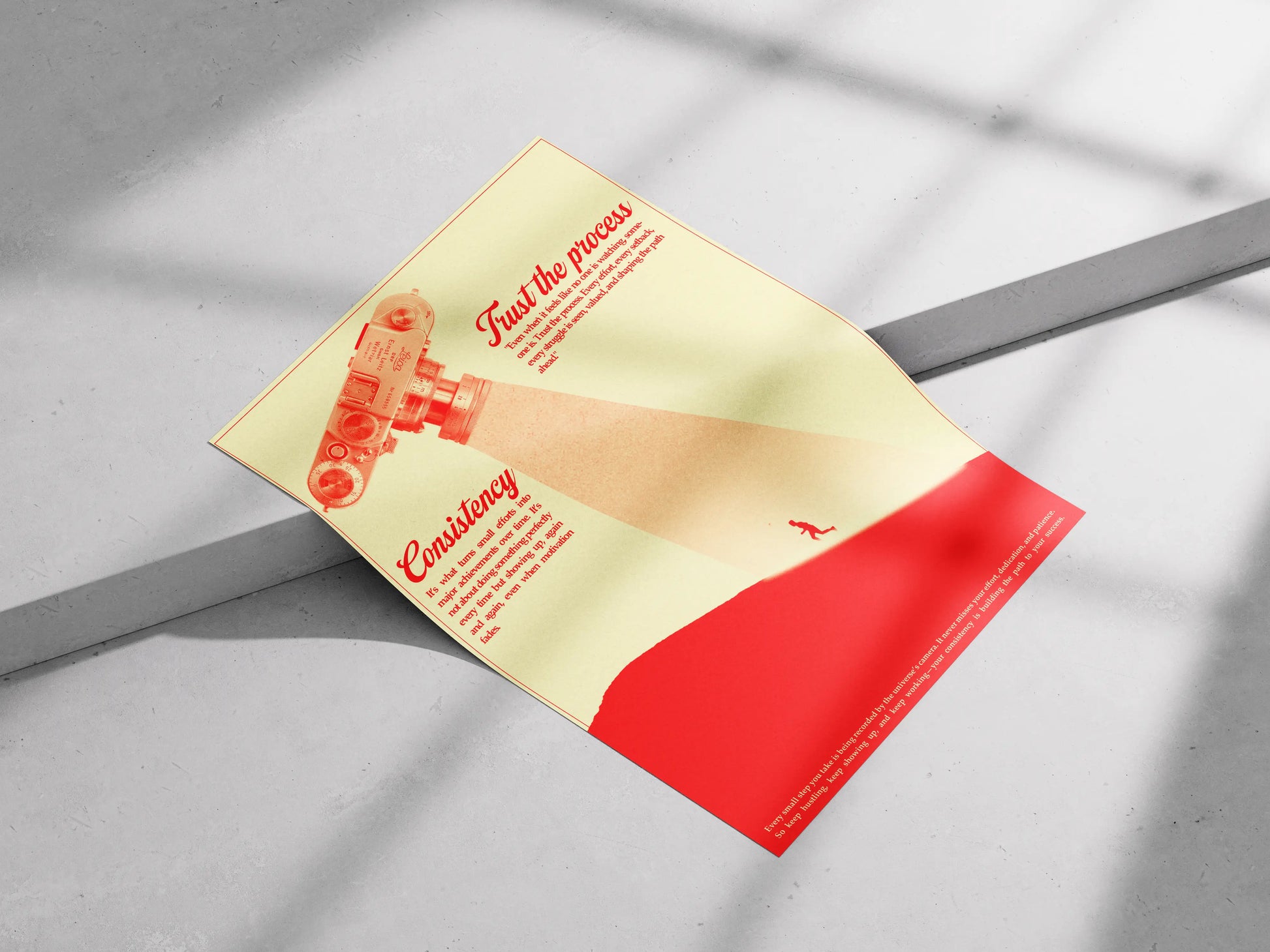 This poster features a striking and symbolic design with a two-color palette of bold red and pale yellow. A vintage Leica camera at the top shines a spotlight onto a single figure running up a hill, illustrating the idea that every small effort is seen and recorded. The poster emphasizes two key themes: "Trust the Process" and "Consistency." The text elaborates on these concepts, highlighting the importance of showing up and having faith in your journey, even when facing setbacks. This piece is a powerful blend of retro aesthetics and motivational messaging, perfect for anyone striving for personal growth and success.