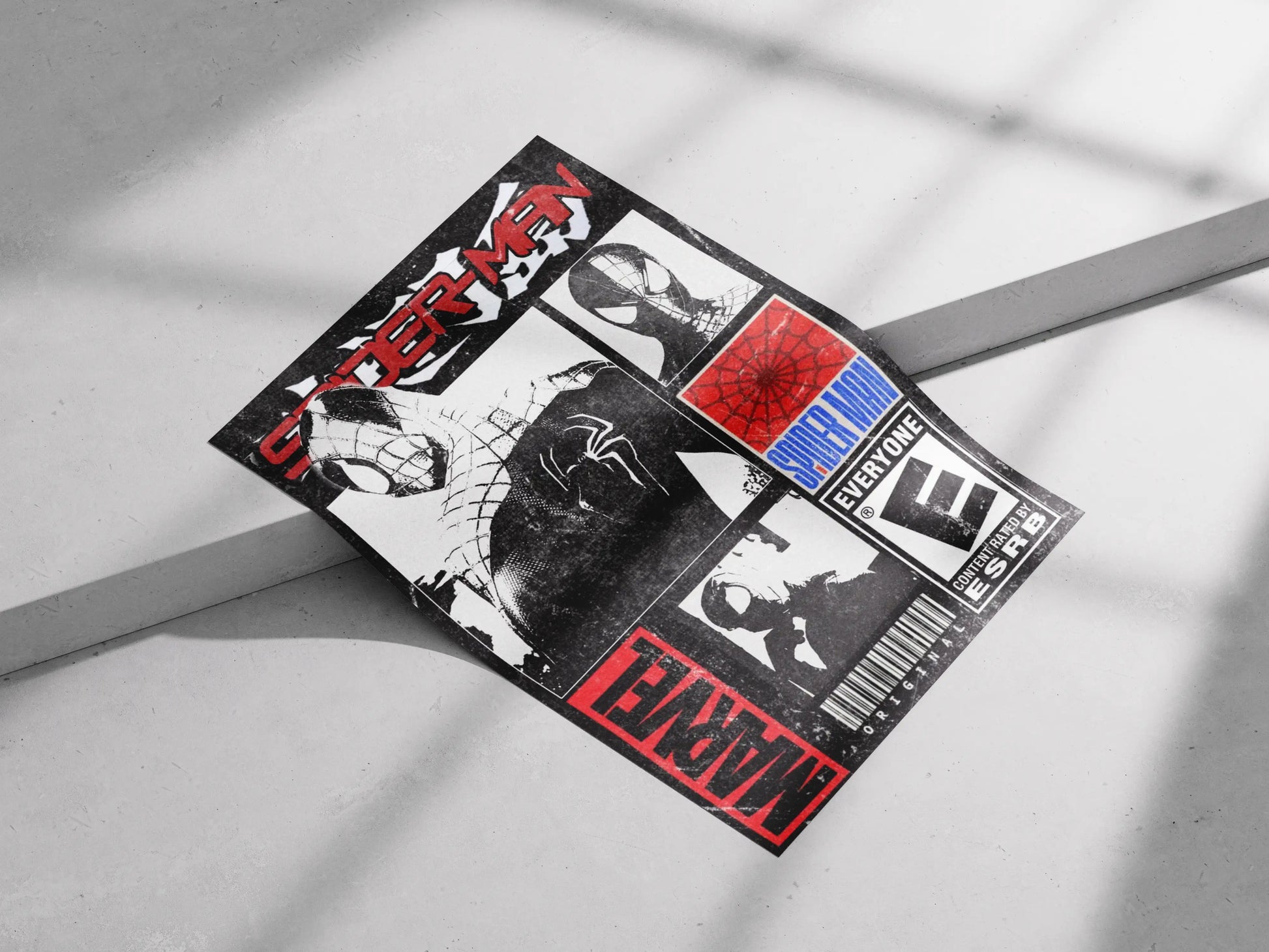 Swing into action with this eye-catching Spider-Man poster! This unique art print features a bold, grungy collage style, combining multiple black-and-white images of the web-slinger with retro typography and a distressed texture.