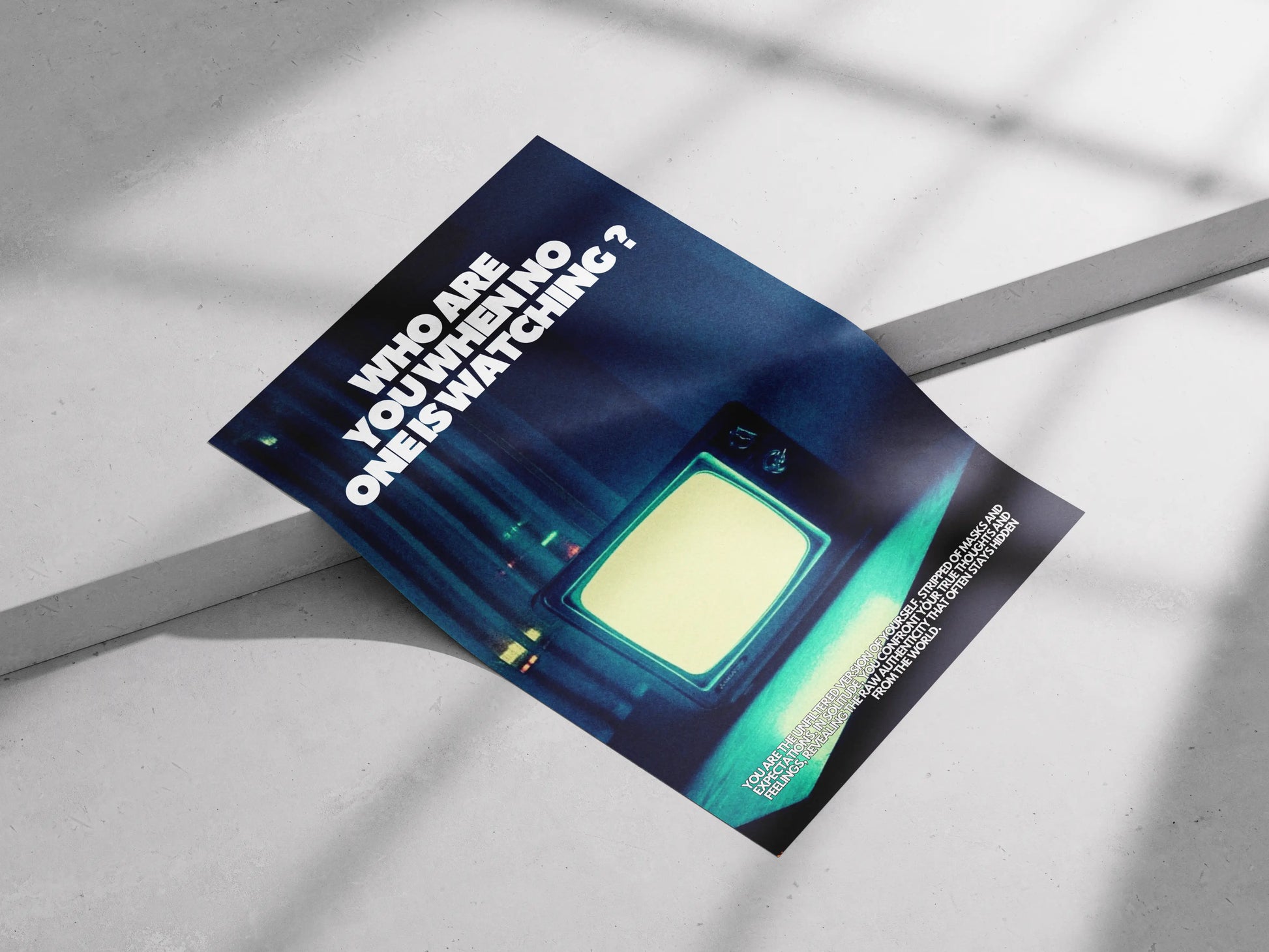 This poster features a retro-futuristic design centered around an old-school CRT television with a glowing, blank screen. The deep blue and purple hues create a moody, nocturnal atmosphere, while the text "WHO ARE YOU WHEN NO ONE IS WATCHING?" poses a thought-provoking, existential question. The surrounding lines of smaller text add an extra layer of detail and introspection, making this a perfect piece for fans of retro technology, cyberpunk aesthetics, or psychological themes.